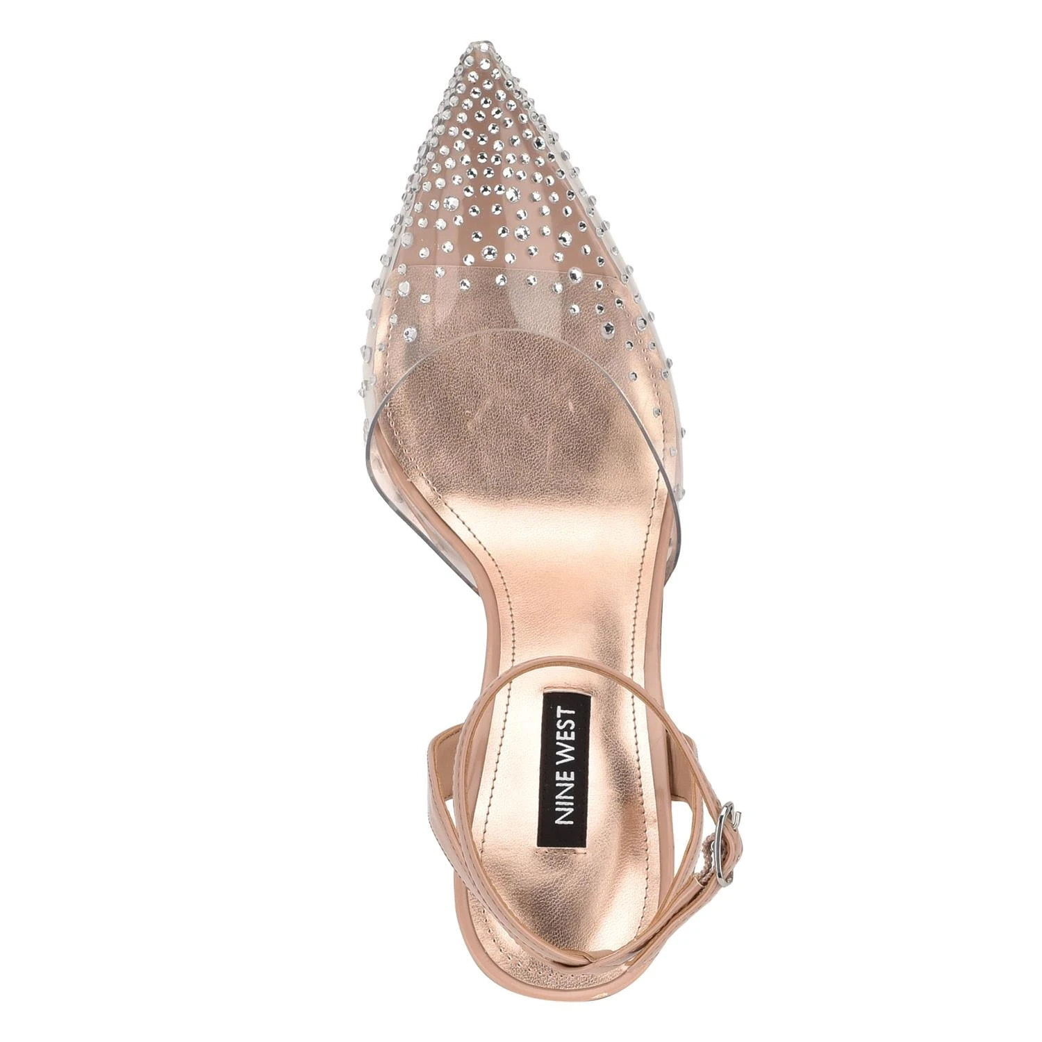 Elevate any formal wear with the sky high stiletto Foreva pump. It features a sexy skinny ankle strap and the trendy translucent toe is embellished with cascading rhinestones.