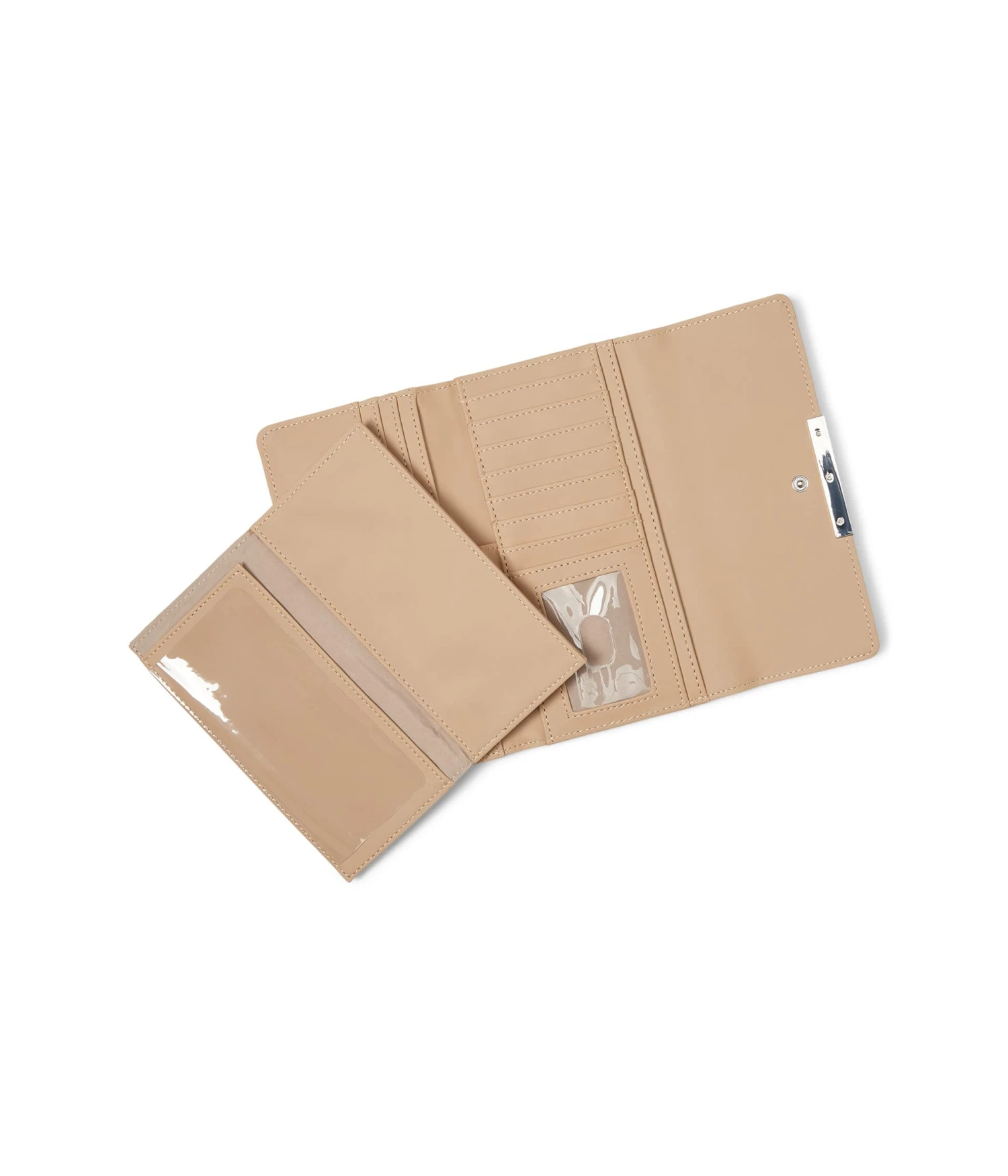 - Includes pull out check book cover with one interior slip and clear flap for check writing, pen holder.